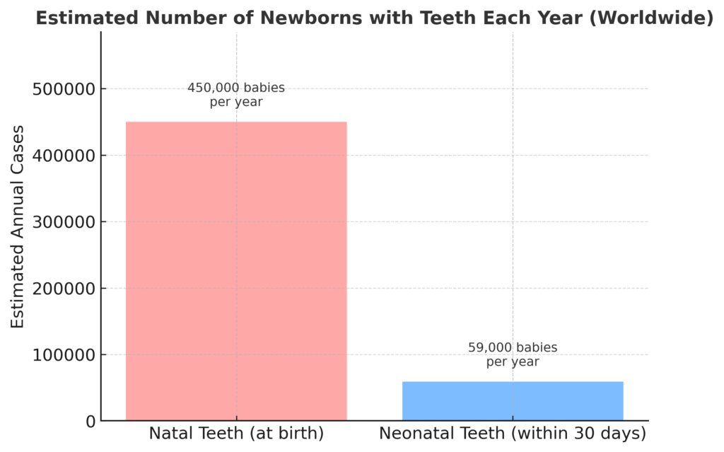 - About 450,000 babies are born annually with natal teeth from early-developing newborn teeth buds